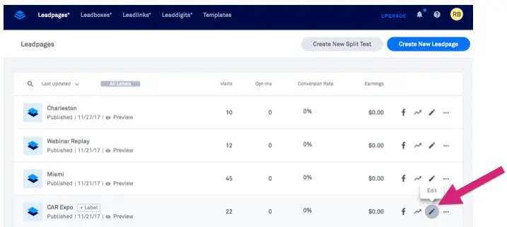To get started, log into your Leadpages account and select the page you’d like to Edit and enable your tracking snippet on or click on Create New Leadpage.