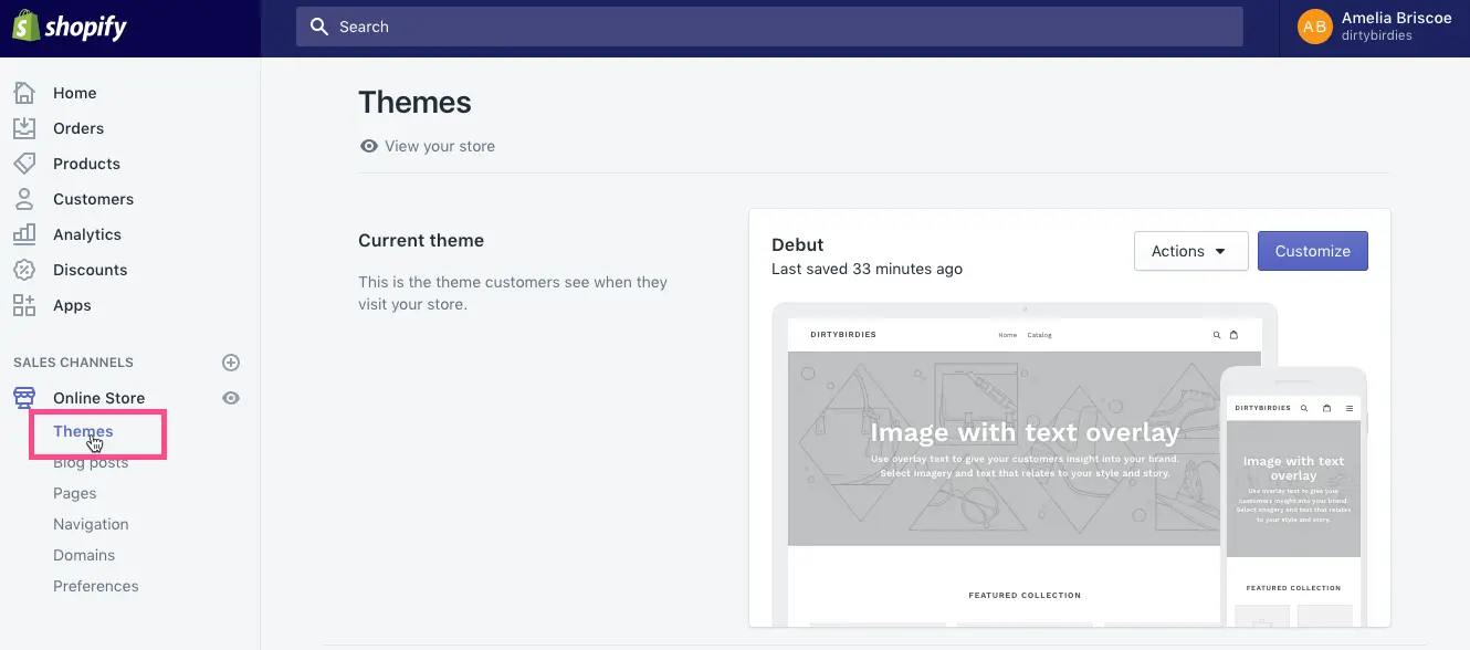 Log into your Shopify Admin area and click on Themes in the left sidebar