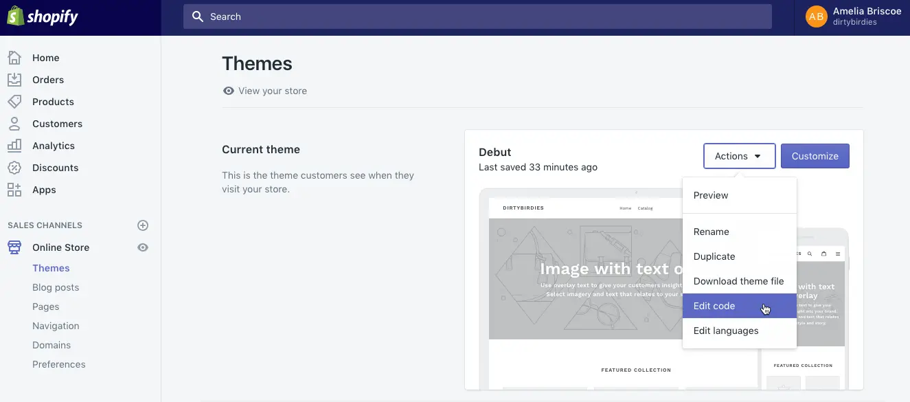 In the Current Theme section, click on the Actions toggle button and select Edit Code .