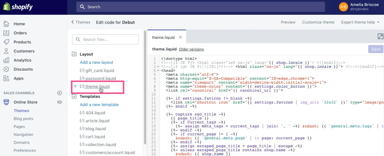 In the theme editing screen, click the theme.liquid link under the ‘Layout’ folder.