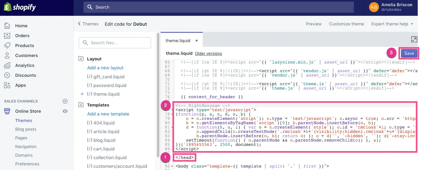 Once the code has been added, click the purple ‘Save’ button in the top right of the theme code editing area.