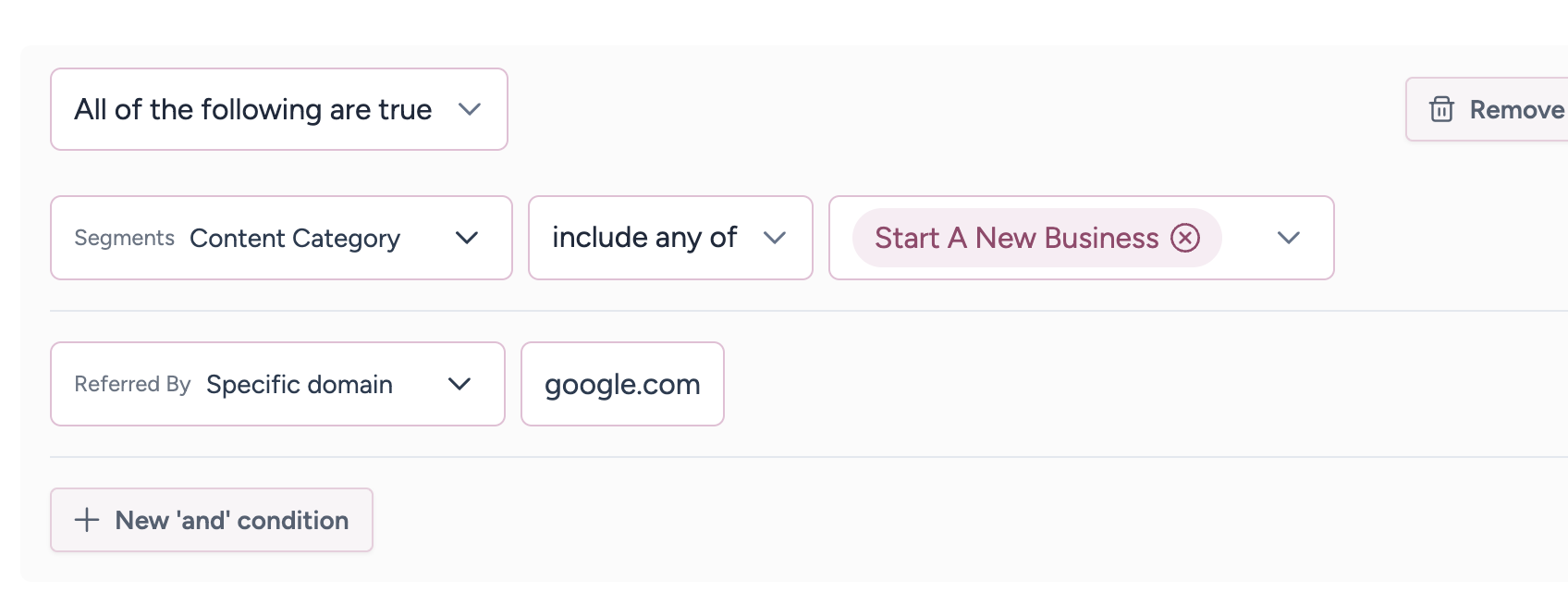 The default behavior of a condition group is to ensure that all conditions within it match. For a visitor to be placed into the below segment, they'd need to have matched into the "Start A New Business" content category and be referred by Google.