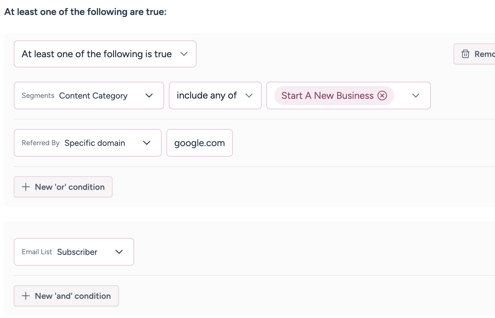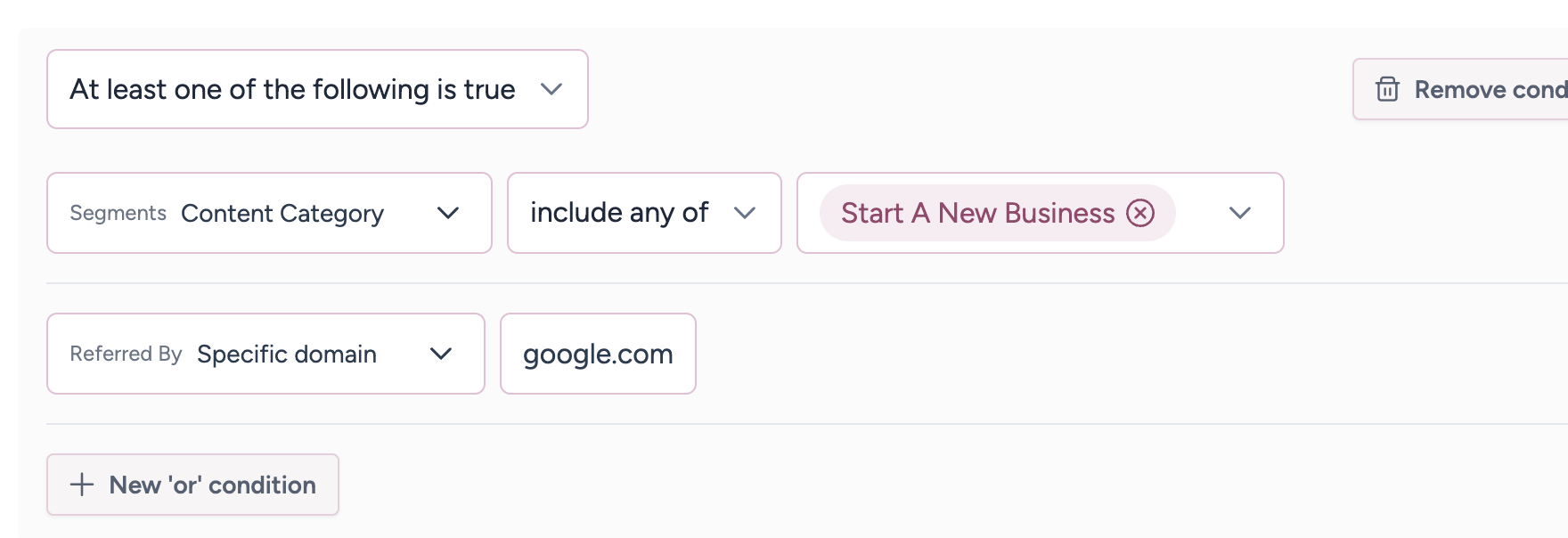 By swapping "All of the following..." to "At least one...", the definition of this segment changes to either matching into the "Start A New Business" category OR having been referred to by Google.