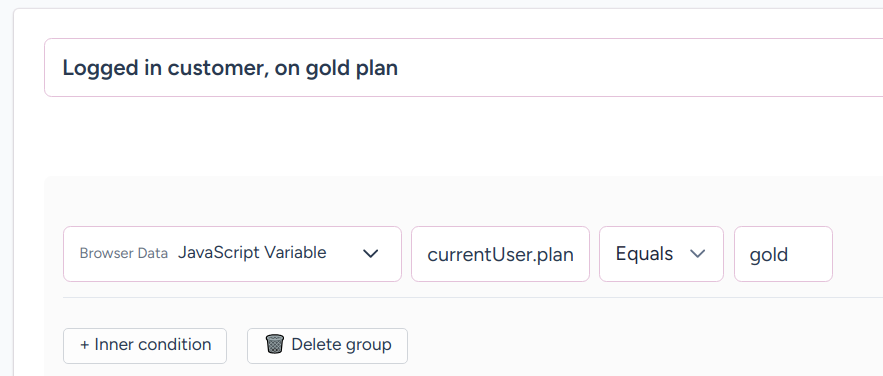 Visitors can be segmented using data that you’ve exposed to your website via JavaScript variables. All that’s required is to attach the variables you want us to reference to the window object wherever you want us to segment.