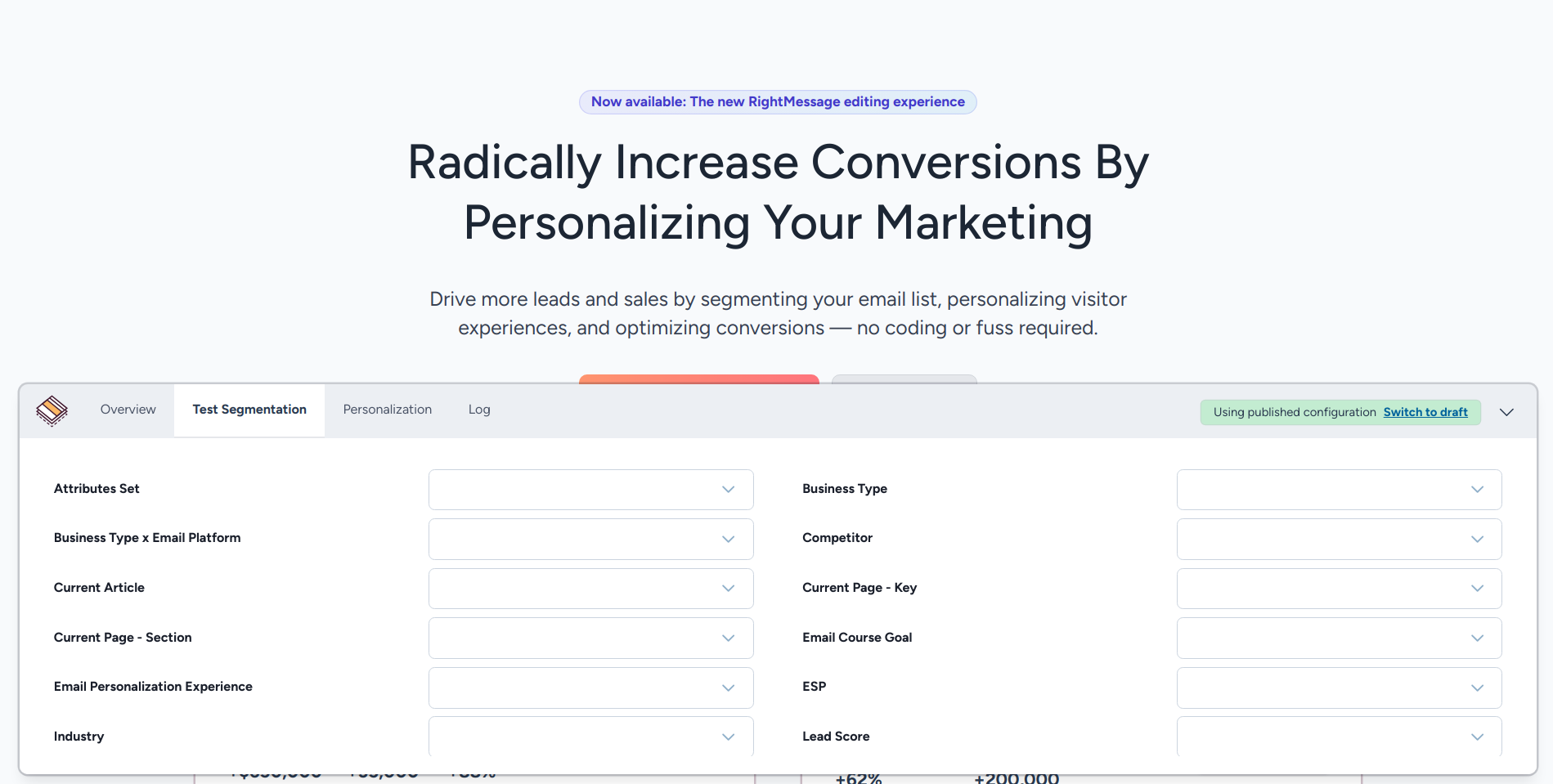 Based on the internal auto-segment rules you set up, accessing something like https://yoursite.com/?industry=nonprofit&size=10-50&tool=xero would have RightMessage place you in these three segments. And because your auto-segment rules are specified to be just for the current page, swapping out “nonprofit” with “retail” would then show a retail-focused variant of your home page.