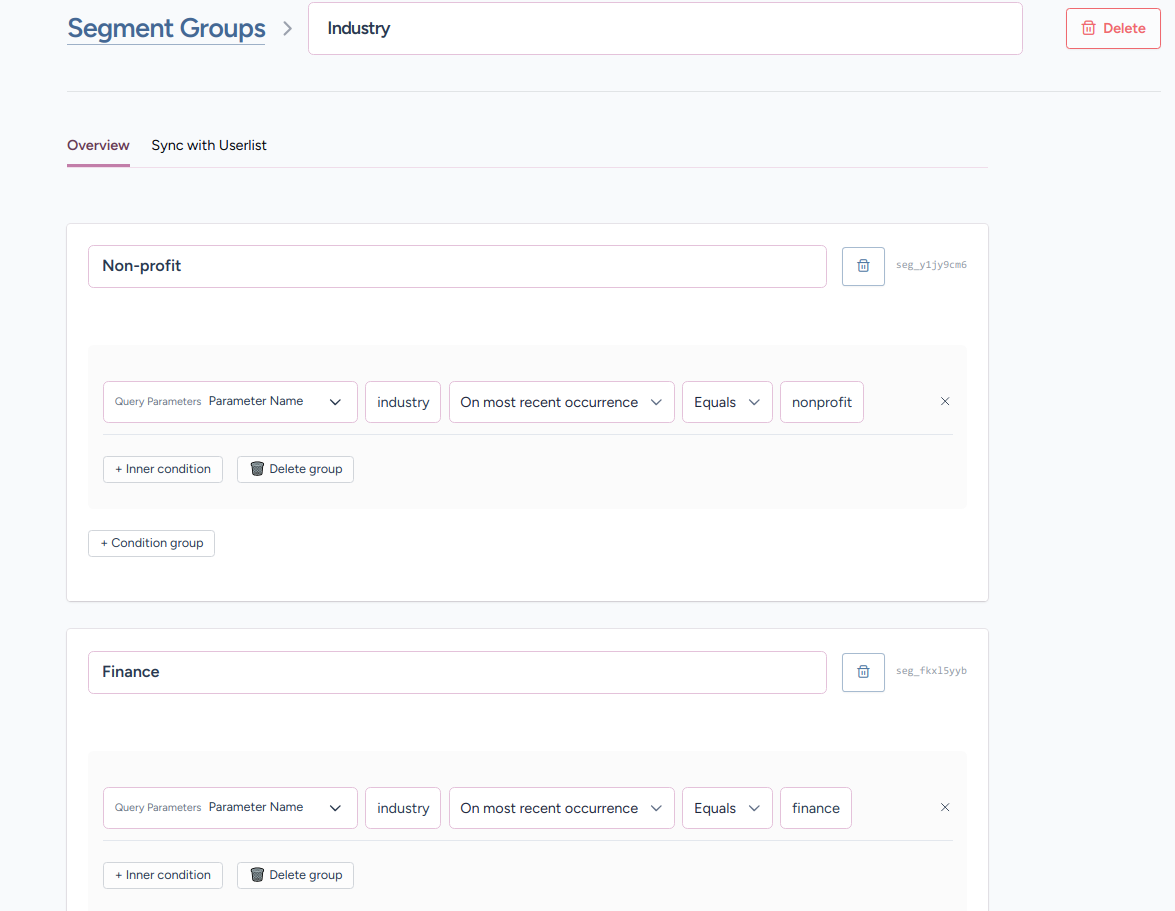 For example, say you have a “Non-Profit” segment within an “Industry” Segment Group. You’d create a rule that matches industry=nonprofit .
