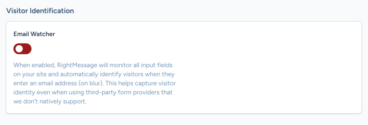 Email Watcher is a more aggressive identification method that monitors any input field across your entire site—not just forms. When enabled, it captures emails as soon as someone types a valid email address and tabs away or presses Enter.