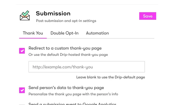 You’re going to want to do this both for attribution and automation reasons. By creating this link, you’ll be able to go into any subscriber in Drip and see that they’ve submitted so-and-so forms.