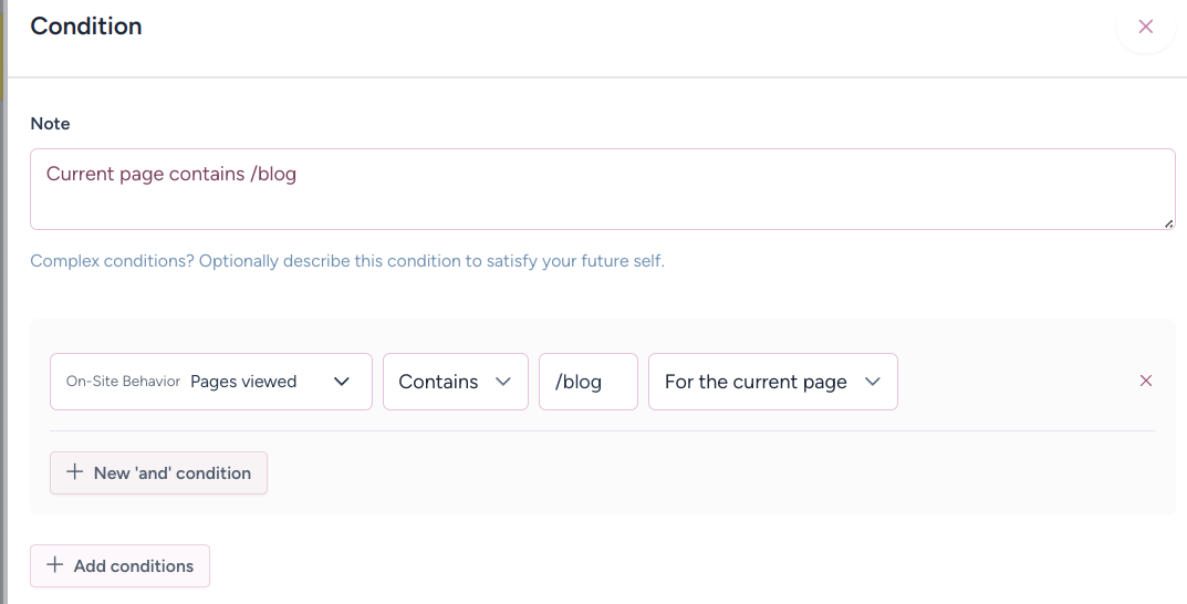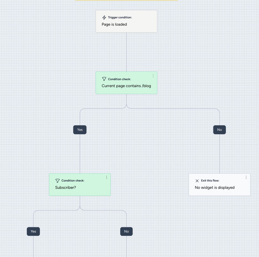Add a Condition node at the top that targets if the current page starts with /blog . If no, exit the Flow. Otherwise, run your Flow.