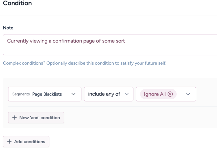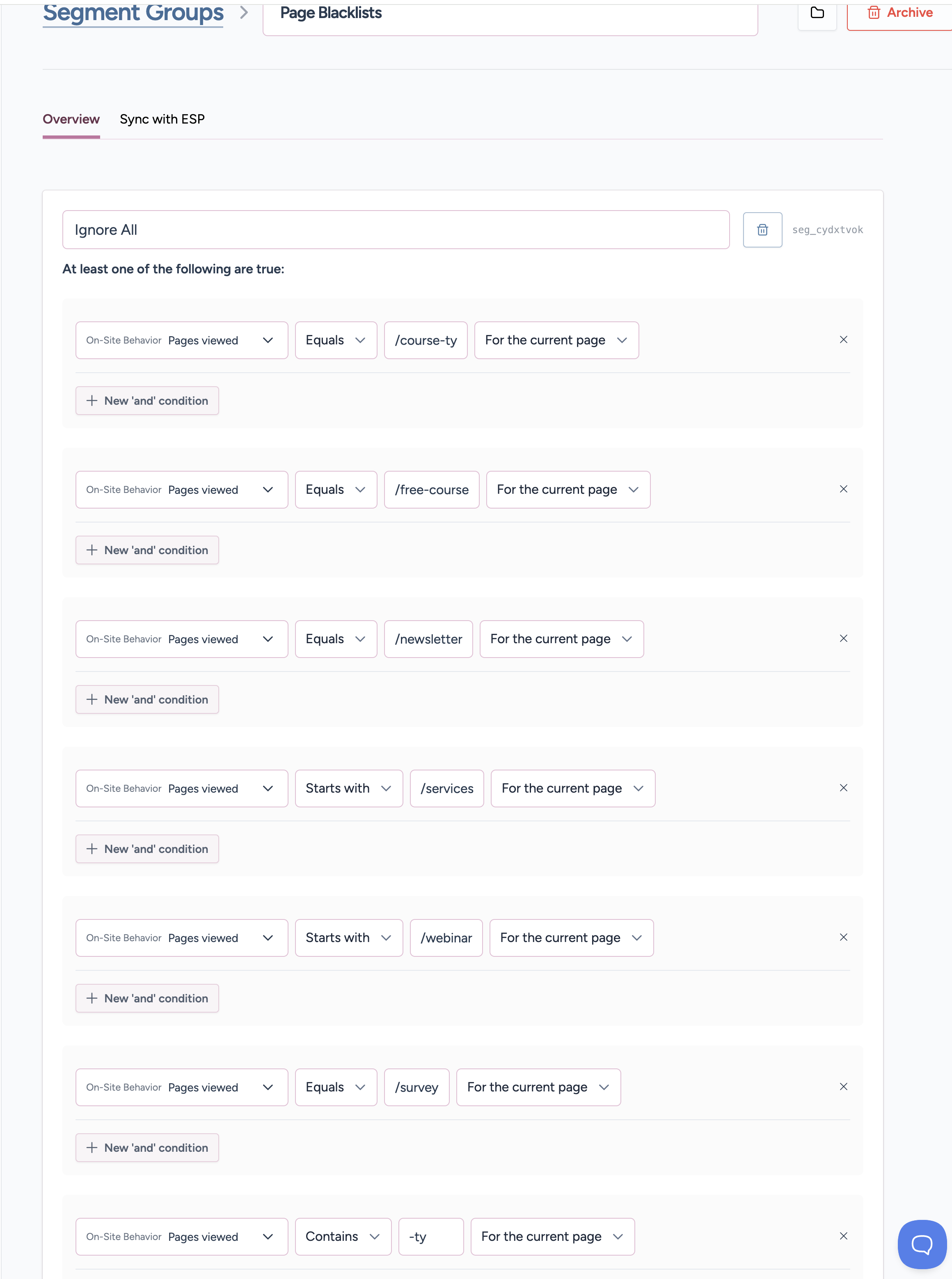 If you find yourself really wanting a giant list of pages that shouldn’t have RightMessage Flows run on them, the easiest way to do this is to create a Page Blacklist Segment Group that has a segment (here it's called Ignore All) that matches all the pages you don’t want funnels run on (i.e. your cart, checkout page, account summaries, courseware, etc.)