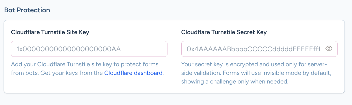 Paste your Cloudflare Turnstile Site Key in the first field