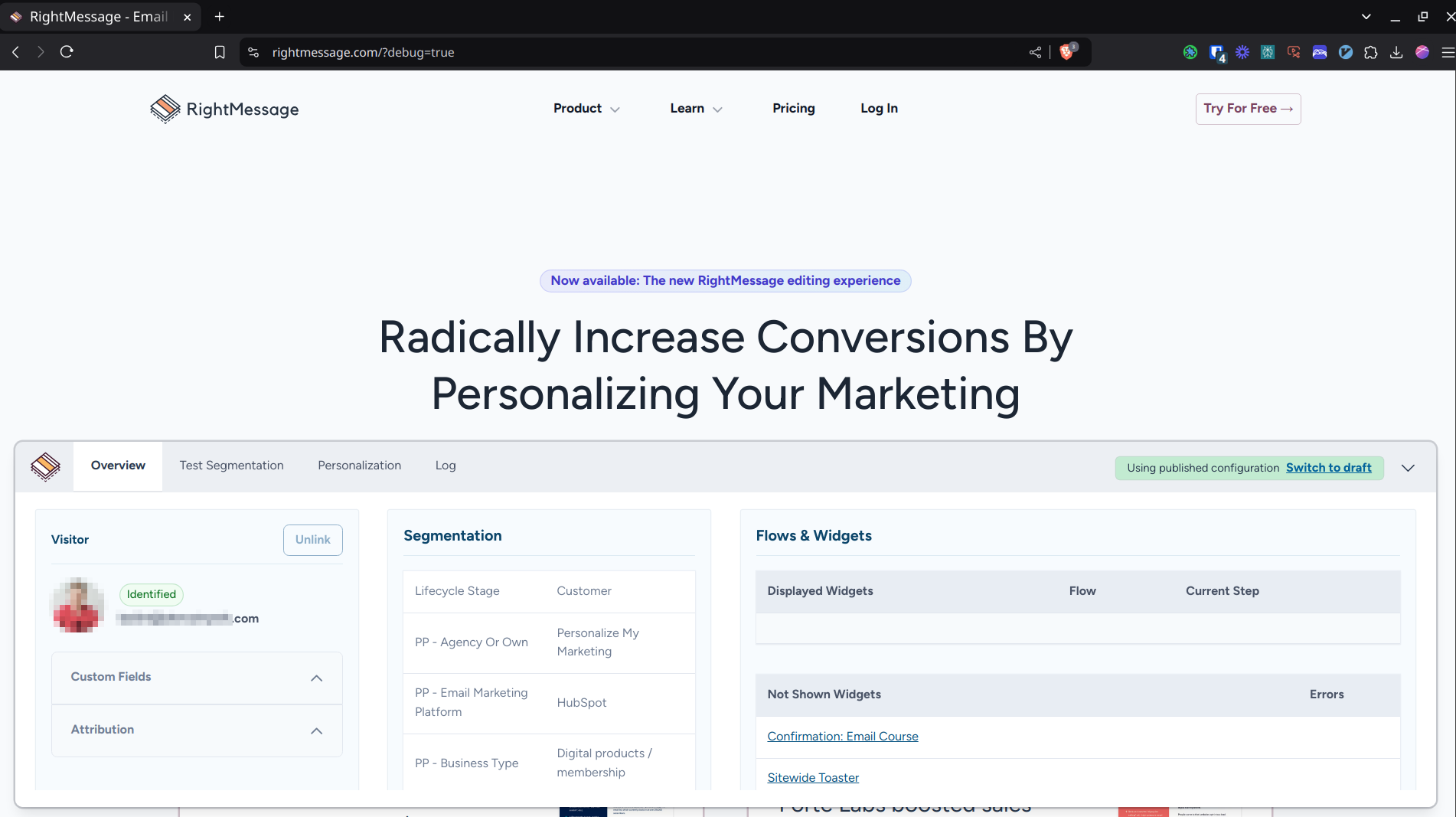 The RightMessage Debugger is a powerful testing tool that lets you preview how different visitor segments experience your website personalization. To activate the debugger, simply add ?debug=true to any URL where RightMessage is installed.